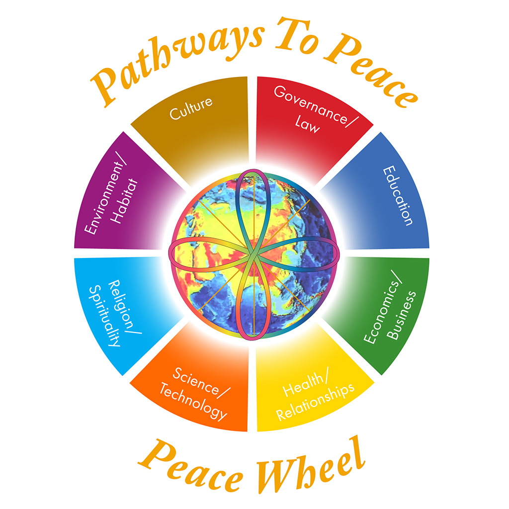 This symbolic model illustrates eight interconnected domains—Governance/Law/Security, Education/Media, Economics/Business, Health/Relationships, Science/Technology, Religion/Spiritual Teachings, Environment/Habitat, and Culture—through which all individuals and sectors can contribute to peace.